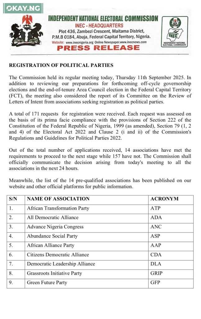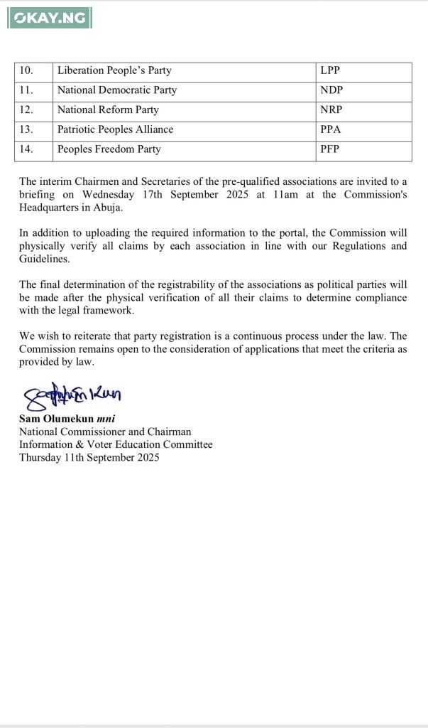 The names of the pre-qualified associations have been published on INEC’s website and other official platforms. Their interim chairmen and secretaries are expected to attend a briefing at INEC Headquarters in Abuja on Wednesday, September 17, 2025.