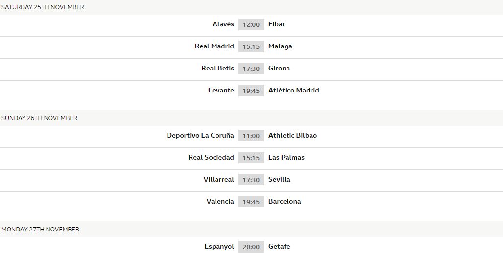 The Spanish La Liga games will kick off by 12 noon on Saturday with Deportivo Alavés welcoming Eibar, followed by Real Madrid game against Málaga etc. The image below contains complete fixtures of Spanish La Liga games: