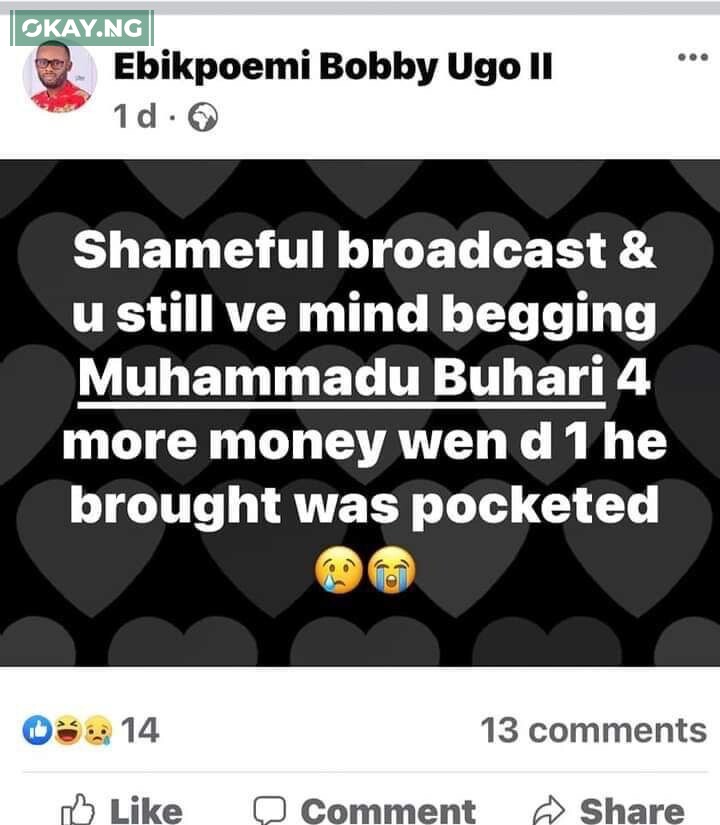 (b)​“Shameful broadcast and you still have mind begging Muhammadu Buhari for more money when the one he brought was pocketed.”
