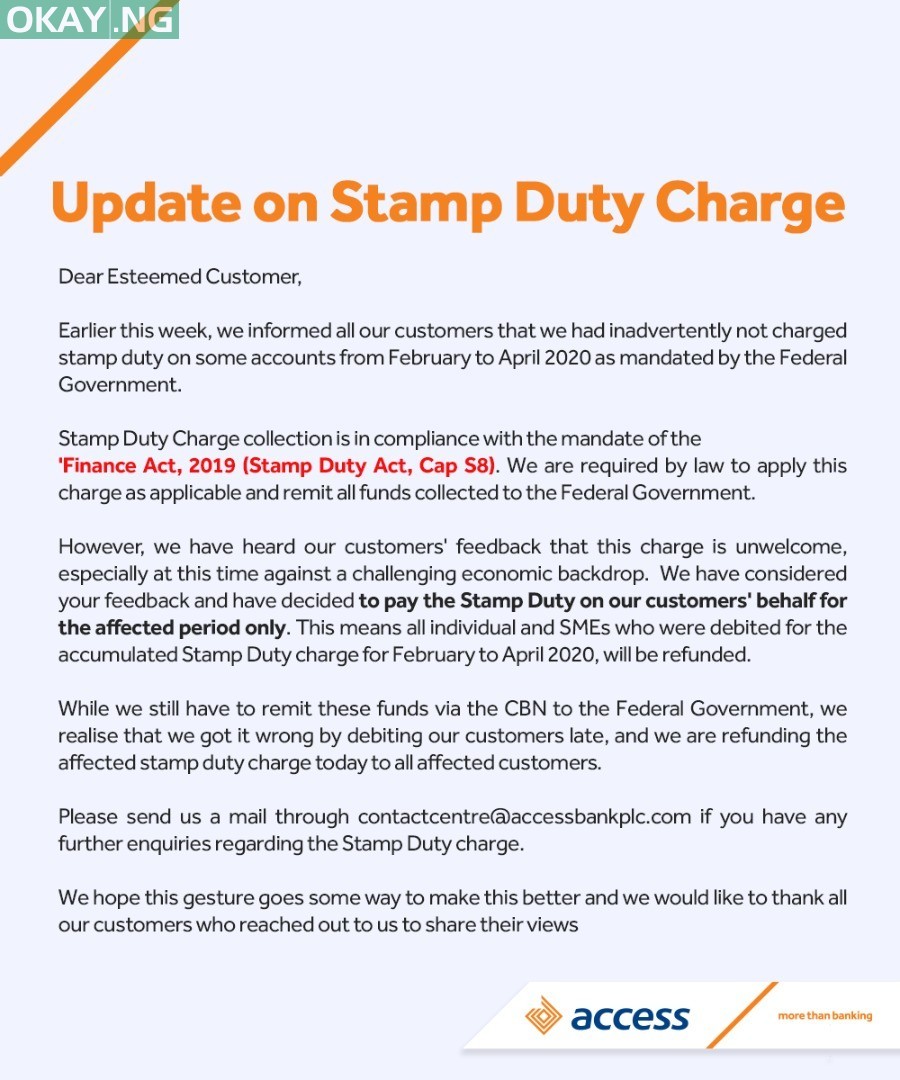 Access Bank has on Sunday said it will refund stamp duty deductions for February to April on behalf of its customers.