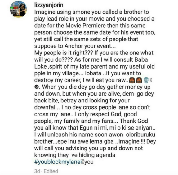 The Actors who had a fight a few days ago when Lizzy Anjorin posted on her Instagram page and threatened a ‘brother'(Saidi Balogun) who played a major role in her movie because he chose the grand finale of his 50th birthday event the same day as that of her movie premiere, ‘Owo Naira Bet’.