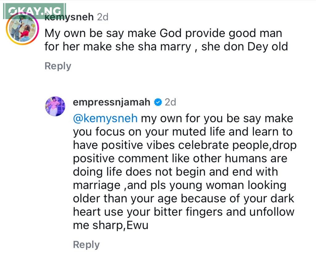 In her reply, she stated, “@kemysneh my own for you be say make you focus on your muted life and learn to have positive vibes, celebrate people, drop positive comment like other humans are doing life does not begin and end with marriage, and pls young woman looking older than your age because of your dark heart use your bitter fingers and unfollow me sharp, Ewu.”