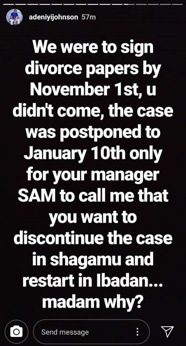 Adeniyi accused Toyin of employing delay tactics in their divorce process, saying she refused to show up in court the last time they were to sign the divorce papers. Due to this, the case was adjourned.