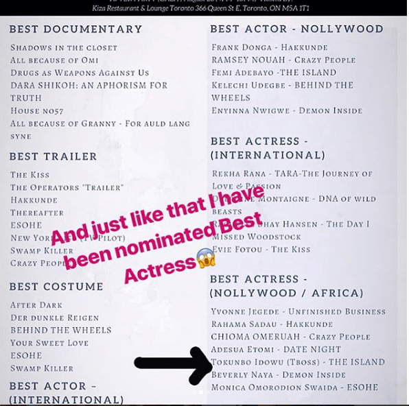 She is nominated for Best Actress in Nollywood for the Toronto International Nollywood Film Festival.