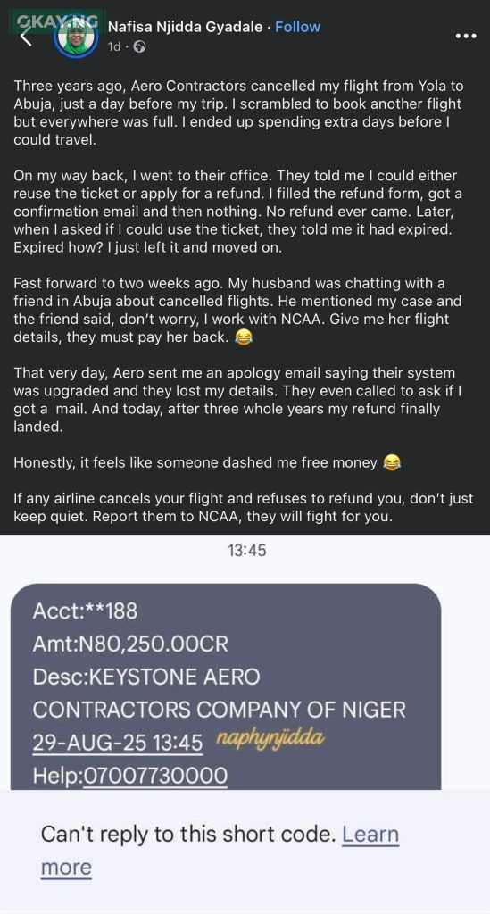 After a three-year wait, a Nigerian traveler has finally received a refund of N80,250 from Aero Contractors following the intervention of the Nigerian Civil Aviation Authority (NCAA).