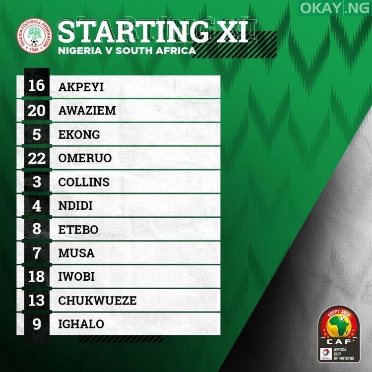 The starting line-up of Nigeria’s Super Eagles against South African in the ongoing Africa Cup of Nations (AFCON) has been released.