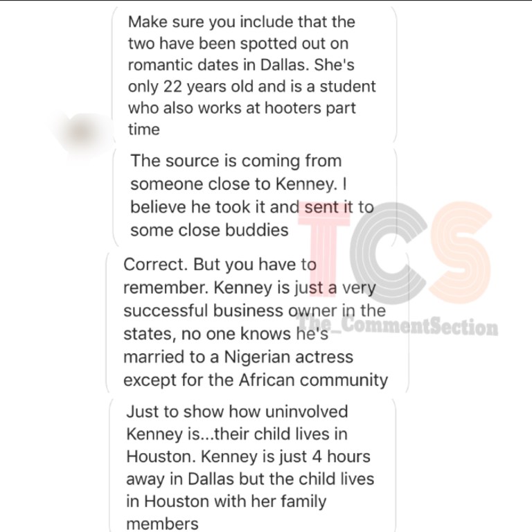 According to a TCS source, Uche’s husband Kenney is dating a 22-year old African American student Teresa and the duo have been spotted out and about on romantic dates in Dallas where he is based.