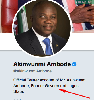 Akinwunmi Ambode is now a former governor of Lagos state as seen on his Twitter biography.