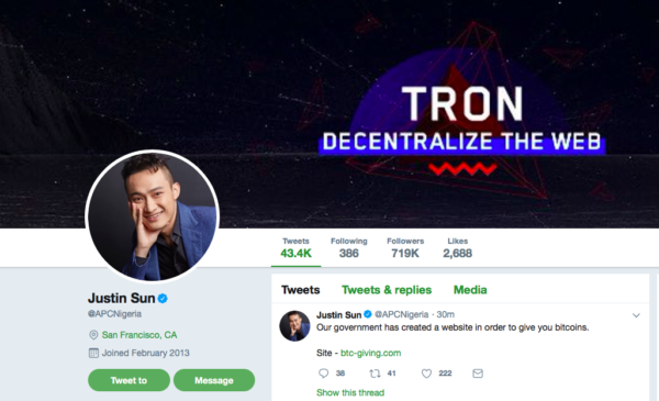 The hacker later changed its Twitter name to Justin Sun, founder of TRON, a crypto network.