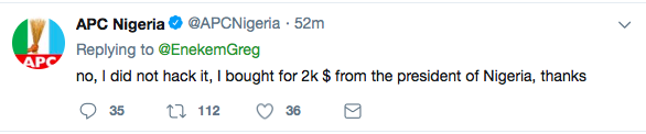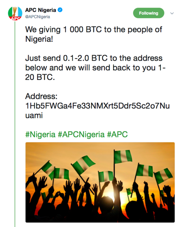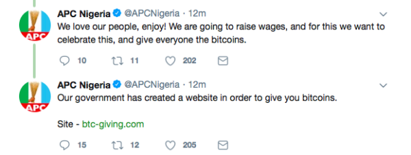 The official Twitter account of Nigeria’s ruling party All Progressives Congress (APC) has been hacked.