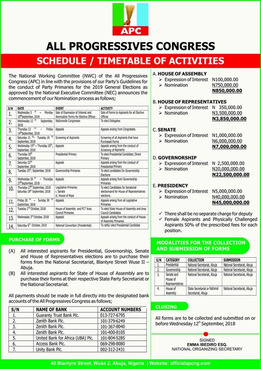 The ruling APC has released party time table of activities for the conduct of 2019 elections.