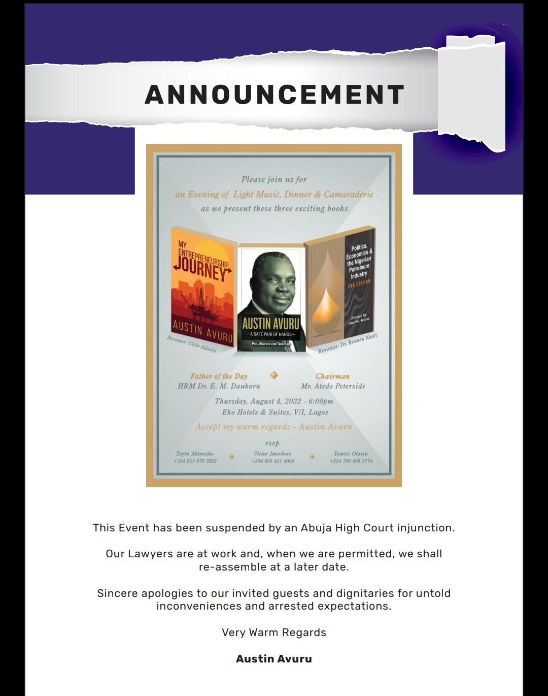 Austin Avuru, founding CEO of Seplat Energy has called off the planned retirement dinner which was to feature the unveiling of his books following an injunction by an Abuja High Court presided over by Justice SB Belgore.