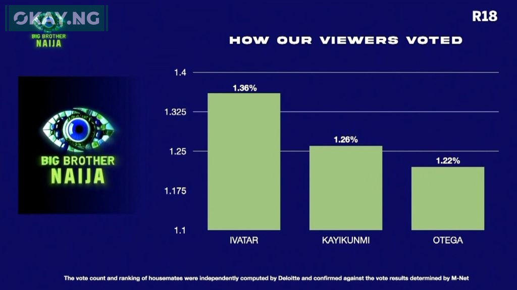 According to the official results released by the organisers, Ivatar secured the highest percentage of votes with 1.36%, narrowly edging out Kayikunmi, who had 1.26%, while Otega finished with 1.22%, making him one of the evicted housemates of the week.