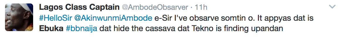 “#HelloSir @AkinwunmiAmbode e-Sir I’ve obsarve somtin o. It appyas dat is Ebuka #bbnaija dat hide the cassava dat Tekno is finding upandan,” the popular Lagos Captain tweeted.