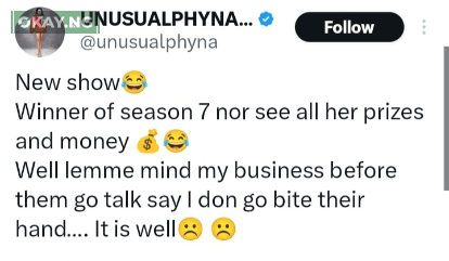In her post, she wrote, “New show. Winner of season 7 nor see all her prizes and money. Well, lemme mind my business before them go talk say I don go bite their hand…. It is well☹️ ☹️”