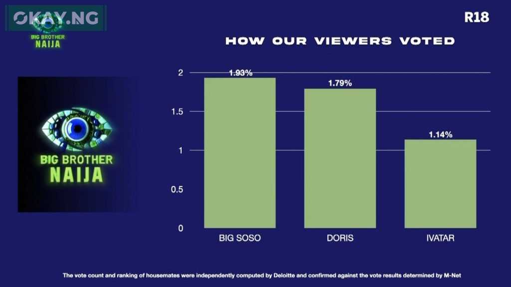 According to the official voting chart released by the organisers, Big Soso led the bottom three with 1.93% of the votes, followed by Doris who polled 1.79%, while Ivatar had the lowest support with just 1.14%.