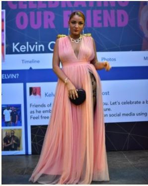 Last weekend in Lagos, former Big Brother Naija star, Gifty stepped out in this lovely pink gown, without a bra, for entrepreneur, Kelvin Orifa’s new company, EMBLUE launch.