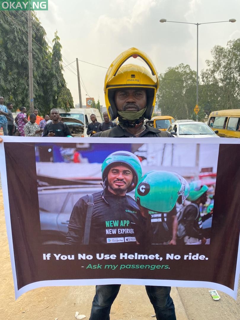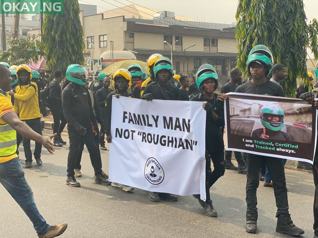 Riders of bike-hailing services like GoKada, Max.ng, ORide hit the street of Lagos to protest ban on motorcycles also known as ‘Okada’ which will take effect on February 1, 2020.