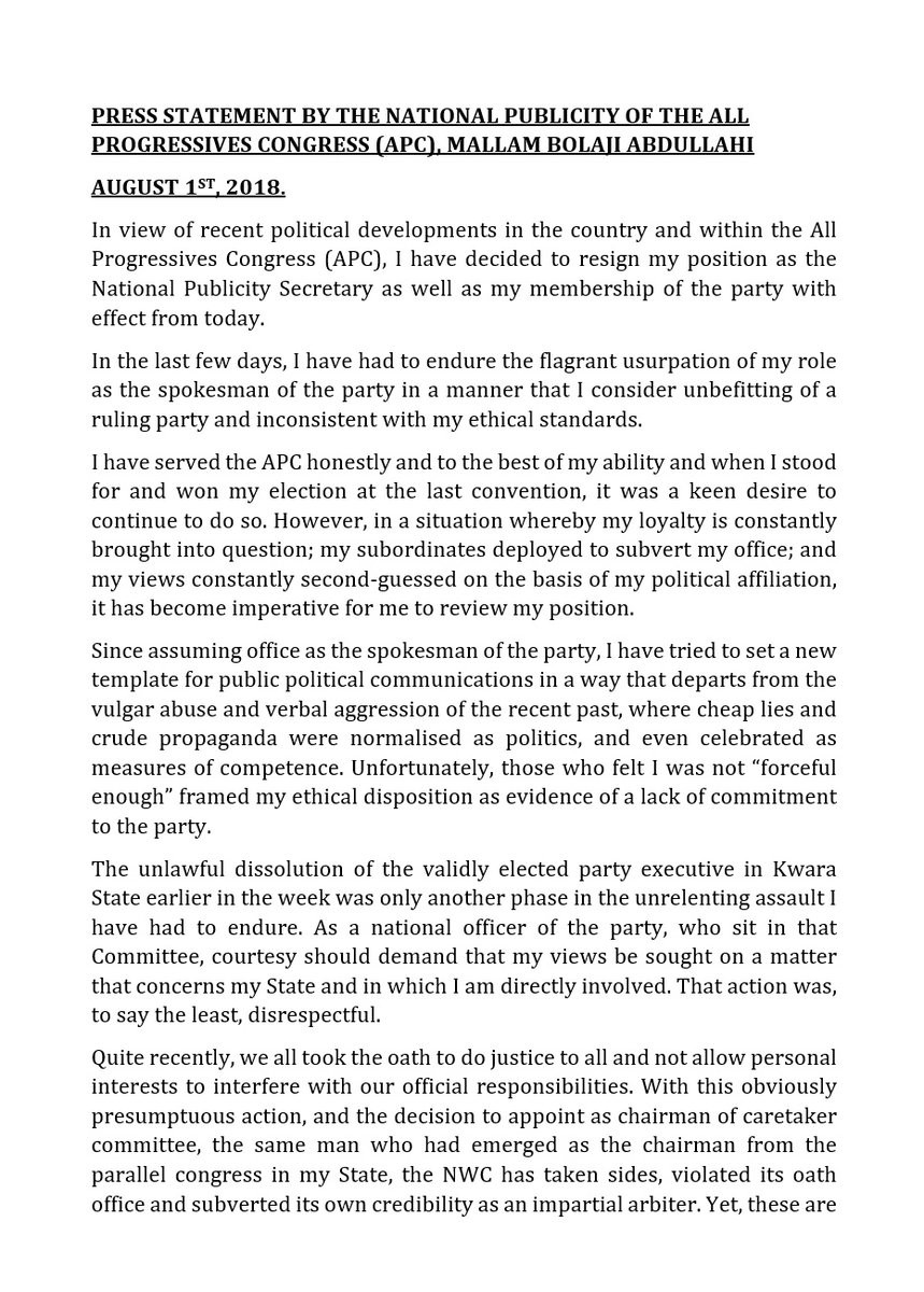 Bolaji Abdullahi has resigned as the spokesman of the All Progressives Congress (APC).