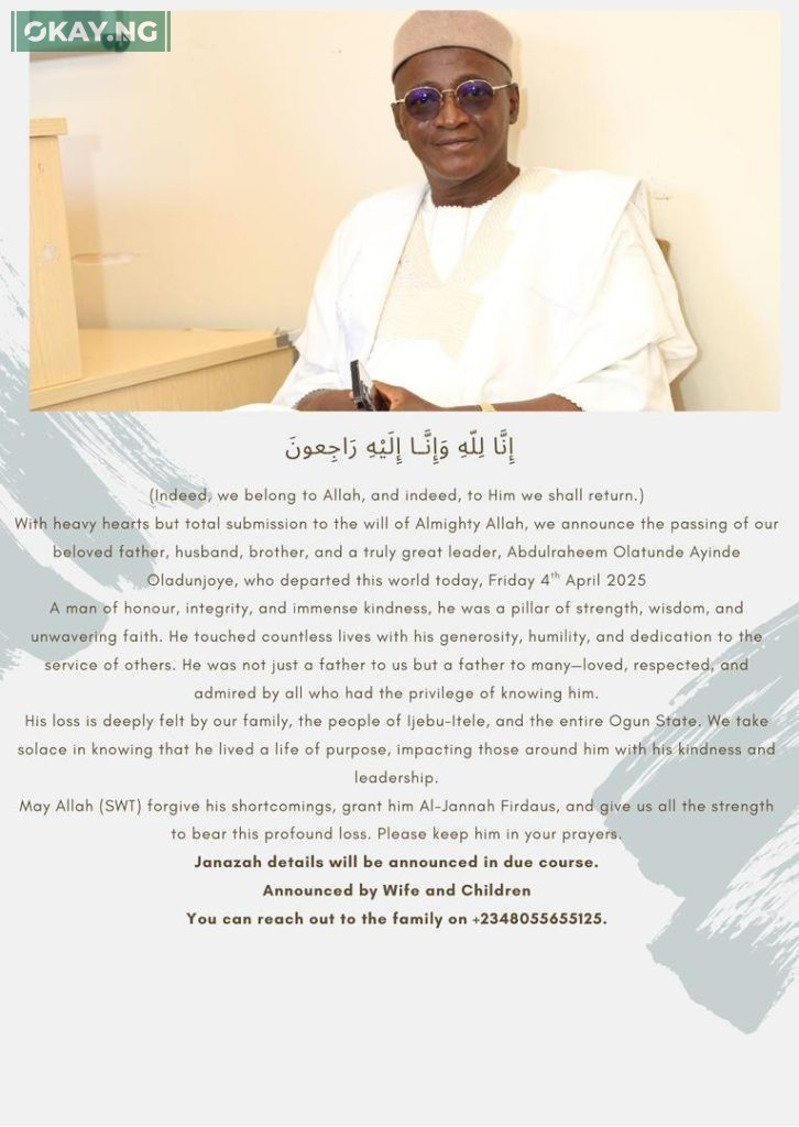 Before his role as spokesman, he served as Chairman of Ijebu East Local Government Area. Governor Dapo Abiodun described his death as a “terrible and devastating loss,” praising Oladunjoye’s dedication and contributions to the party and state government.