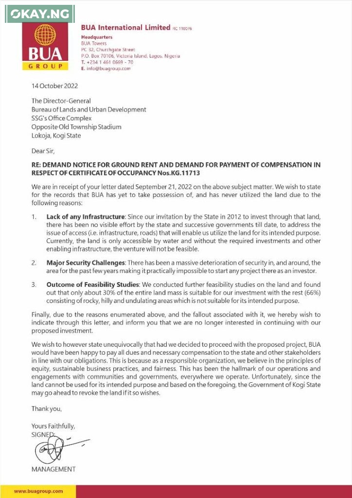 We wish to however state unequivocally that had we decided to proceed with the proposed project, BUA would have been happy to pay all dues and necessary compensation to the state and other stakeholders in line with our obligations. This is because as a responsible organization, we believe in the principles of equity, sustainable business practices, and fairness. This has been the hallmark of our operations and engagements with communities and governments, everywhere we operate. Unfortunately, since the land cannot be used for its intended purpose and based on the foregoing, the Government of Kogi State may go ahead to revoke the land if it so wishes.