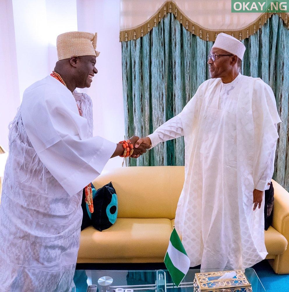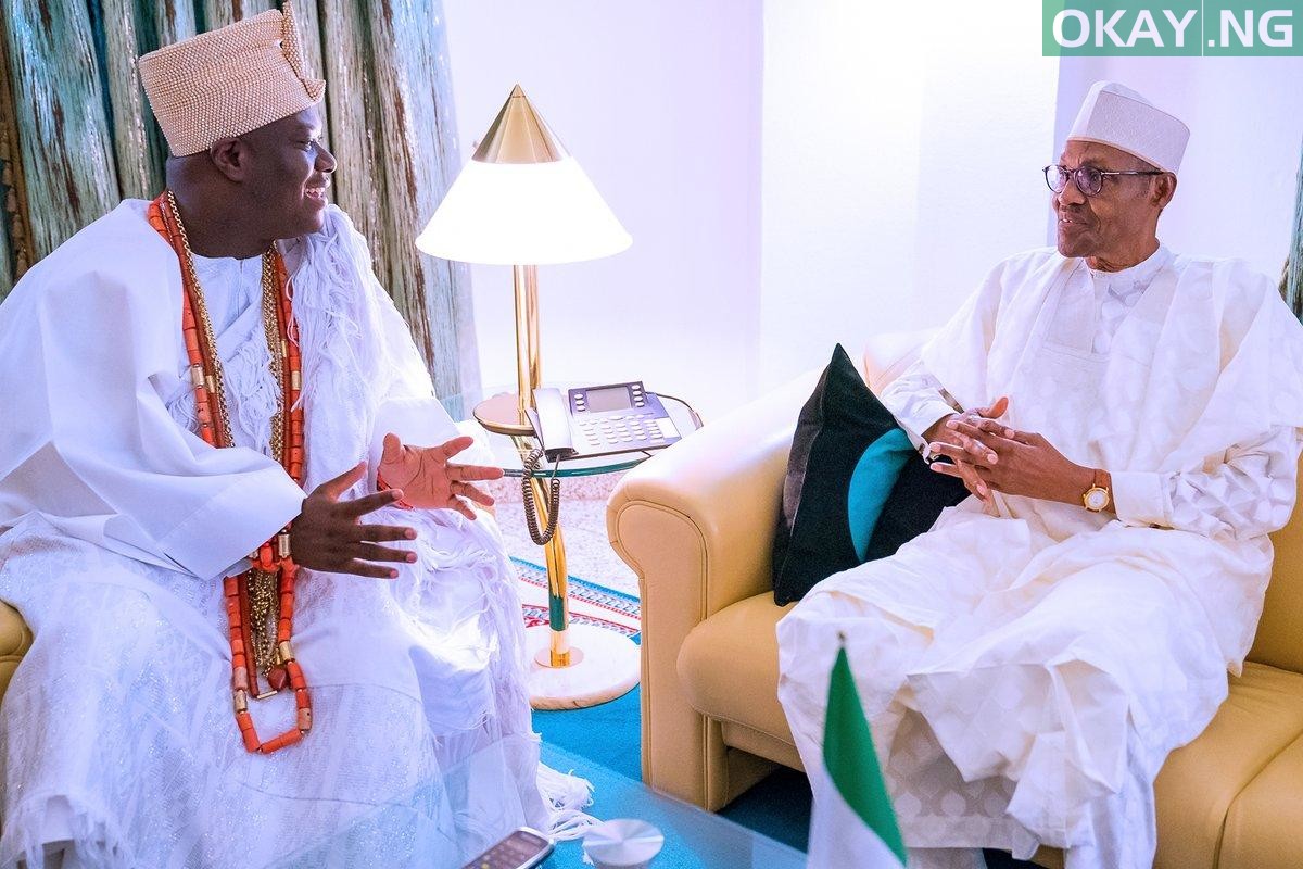 President Buhari receives in audience Ooni of Ife Imperial majesty Oba Adeyeye Ogunwusi Ojaja II at the State House on 18th July 2019.
