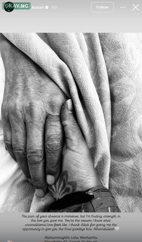 Hanan Buhari, daughter of the late former President Muhammadu Buhari, has shared a deeply emotional tribute recounting her final moments with her father before his death in a London hospital on July 13, 2025.