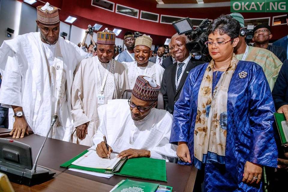 President Buhari appended his signature to the treaty at exactly 10: 47 a.m. in the presence of African Heads of State and Government, delegates and representatives from the private sector, civil society and the media attending the 12th Extraordinary Summit of the African Union on Launch of the Operational Phase of the AfCFTA.
