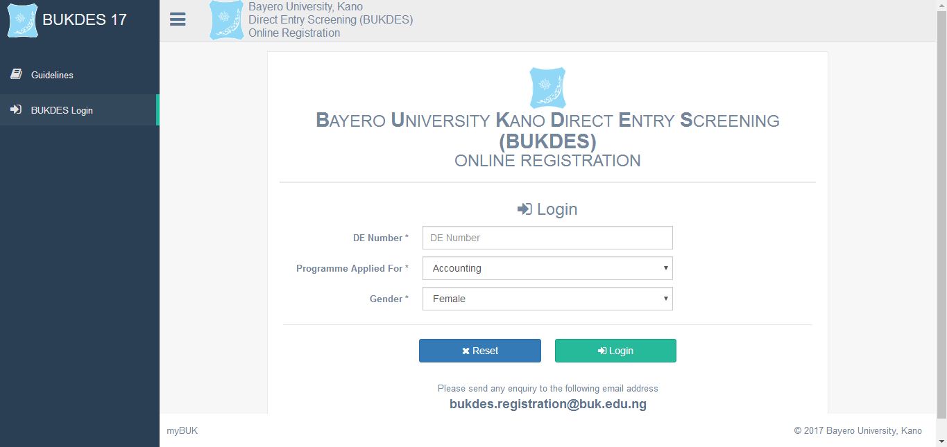 -Visit the BUK DE screening website via; http://mybuk.buk.edu.ng/bukdes2017/bukdes_login.php