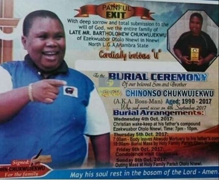 7;00am – Body Leaves Akwudo Mortuary to his father’s compound 10;00am – Burial Mass By Holy Family Parish Otolo Nnewi