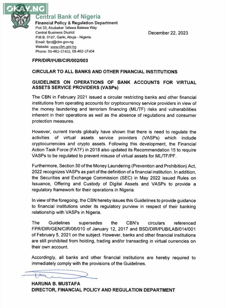 According to the circular, Section 30 of the Money Laundering (Prevention and Prohibition) Act, 2022, recognizes VASPs as part of the definition of a financial institution. This legal recognition underscores the evolving nature of financial regulations in Nigeria.