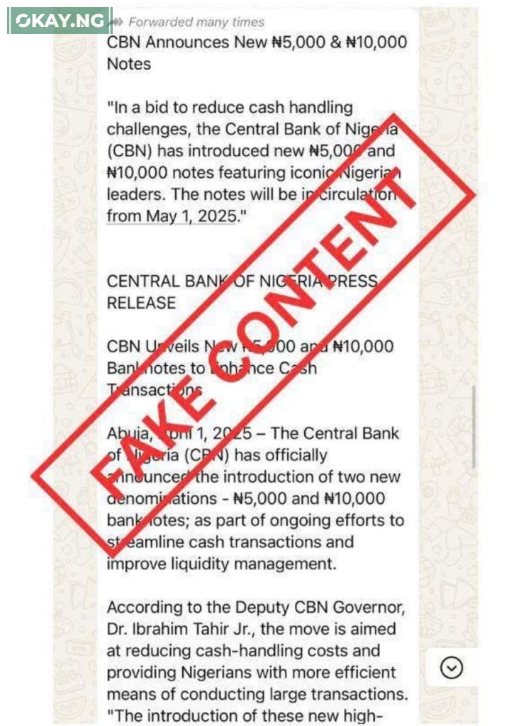 The fabricated report had quoted this non-existent “Deputy Governor” as stating that the introduction of the new high-denomination notes was intended to reduce cash-handling costs and streamline large transactions. The report also wrongly asserted that the new notes would feature portraits of Chief Obafemi Awolowo (N5,000) and Dr. Nnamdi Azikiwe (N10,000) and would incorporate advanced security features. Furthermore, the false report stated that the nationwide rollout of these new notes was scheduled for May 1, 2025, with commercial banks instructed to distribute them through ATMs and over-the-counter transactions. The CBN’s consistent and clear denial underscores the importance of verifying information from official sources.