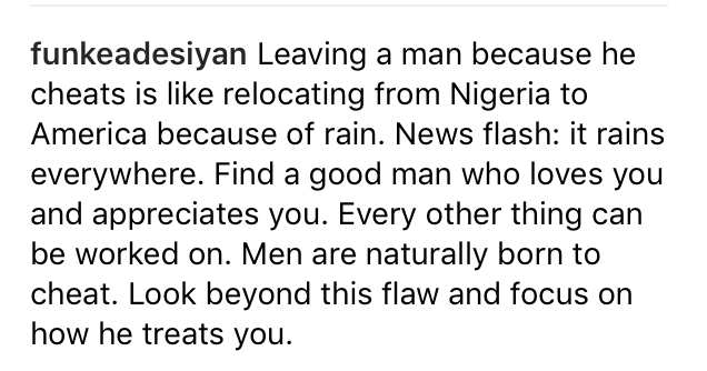 “Leaving a man because he cheats is like relocating from Nigeria to America because of rain. News flash: it rains everywhere. Find a good man who loves you and appreciates you. Every other thing can be worked on. Men are naturally born to cheat. Look beyond this flaw and focus on how he treats you….”