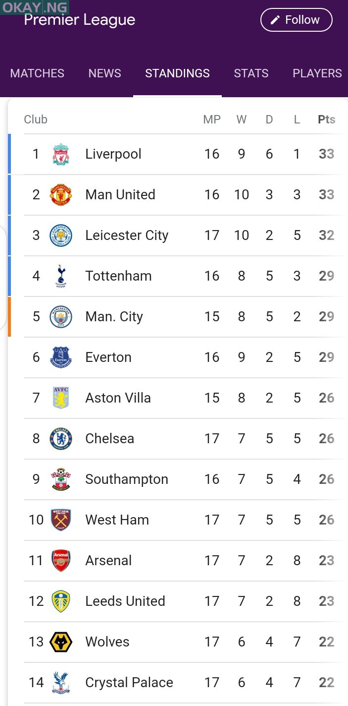 The table shows Liverpool, Manchester United, Leicester City and Tottenham as the top four teams respectively. All the four teams excluding Liverpool experienced wins with paused them further up the table.