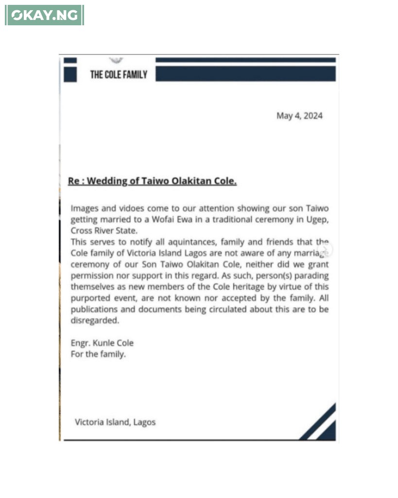 The letter read: “Images and videos come to our attention showing our son Taiwo getting married to a Wofai Ewa in a traditional ceremony in Ugep, Cross River State. This serves to notify all acquaintances, family, and friends that the Cole family of Victoria Island Lagos are not aware of any marriage ceremony of our Son Taiwo Olakitan Cole, neither did we grant permission nor support in this regard. As such, person(s) parading themselves as new members of the Cole heritage by virtue of this purported event, are not known nor accepted by the family. All publications and documents being circulated about this are to be disregarded.”