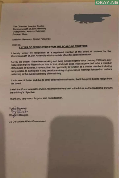 A member of the Board of Trustees of Commonwealth of Zion Assembly (COZA), Obafemi Banigbe has tendered his resignation letter.