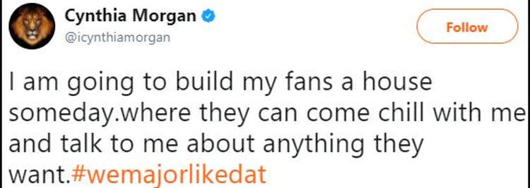 Northside Music Inc. singer Cynthia Morgan has promised to build her fans a house someday.