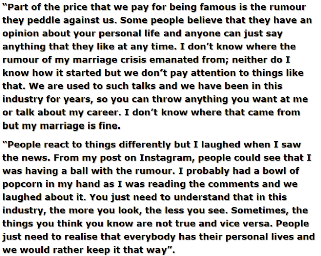 The beautiful mother of one has responded months after her Ghanaian hubby, Chris Attoh shut down the rumour.