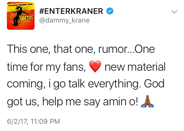 Dammy Krane has taken to his Twitter account to react to news of his arrest in the United States.