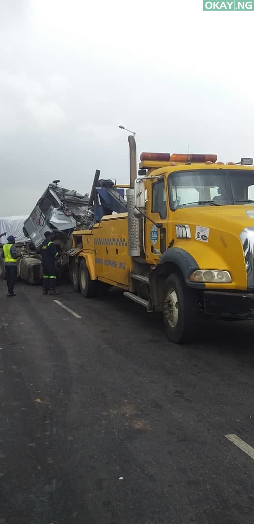 The statement reads: “On getting to the scene of incident, a dangote truck fully loaded with cement had a brake failure and had a head-on collision with a Primero blue Mass Transit bus with registration number LSR-228XS conveying 40 seated and 20 standing passengers.