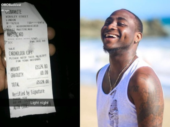 Known for his extravagant lifestyle , Davido showed off the receipt of his bills on Snapchat which amounted to 5,129 pounds.