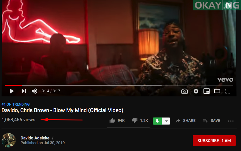 Davido has secured a new record after his video “Blow My Mind” with Chris Brown reached one million views on YouTube.