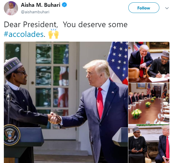 Aisha Buhari, Wife of President Muhammadu Buhari on Monday said the President deserved some accolades for his United States’ visit.