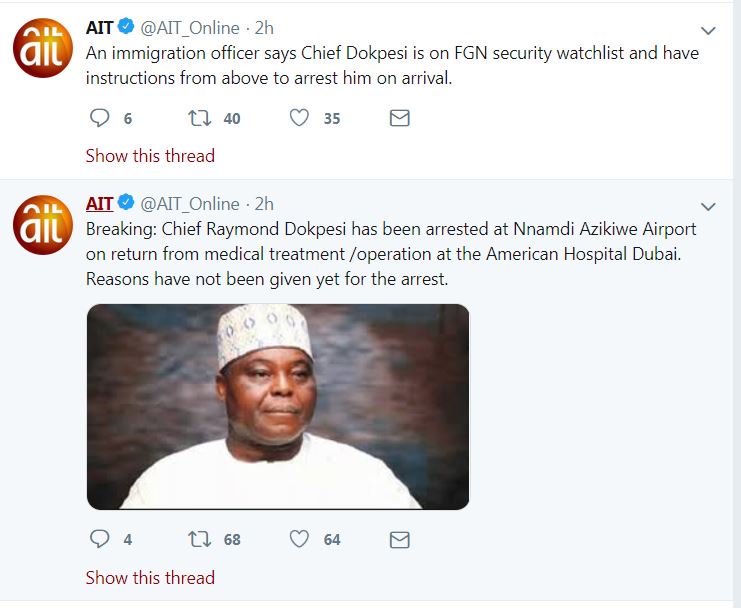 Dr Raymond Dokpesi, founder of DAAR Communications, owners of African Independent Television (AIT), has been arrested at Nnamdi Azikiwe Airport, Abuja.