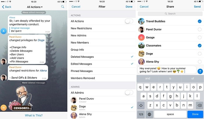 Another noticeable feature is for supergroup users. Supergroups can now have up to 10,000 users. Admins now have more granular controls, including selecting what other admins can do within the group, prevent certain users from performing certain tasks like sending messages, media, stickers, etc. (this is really interesting) within the group, and seeing what other admins have been up to in Recent Actions in the admins page.