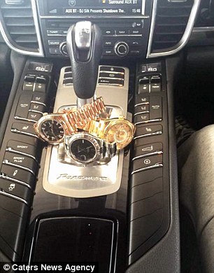 • another image, featuring three watches wrapped around a Porsche Panamera gear stick, was captioned: ‘Have you seen a 100k well if you haven’t this what a hundred k plus