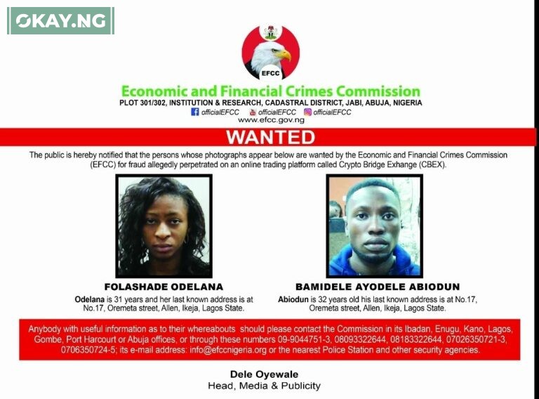 The EFCC’s statement read in part: “The public is hereby notified that the persons whose photographs appear below are wanted by the Economic and Financial Crimes Commission (EFCC) for fraud allegedly perpetrated on an online trading platform called Crypto Bridge Exchange (CBEX). FOLASHADE ODELANA. Odelana is 31 years old and her last known address is at No. 17, Oremeta Street, Allen, Ikeja, Lagos State. BAMIDELE AYODELE ABIODUN. Abiodun is 32 years old. His last known address is at No.17, Oremeta Street, Allen, Ikeja, Lagos State.”