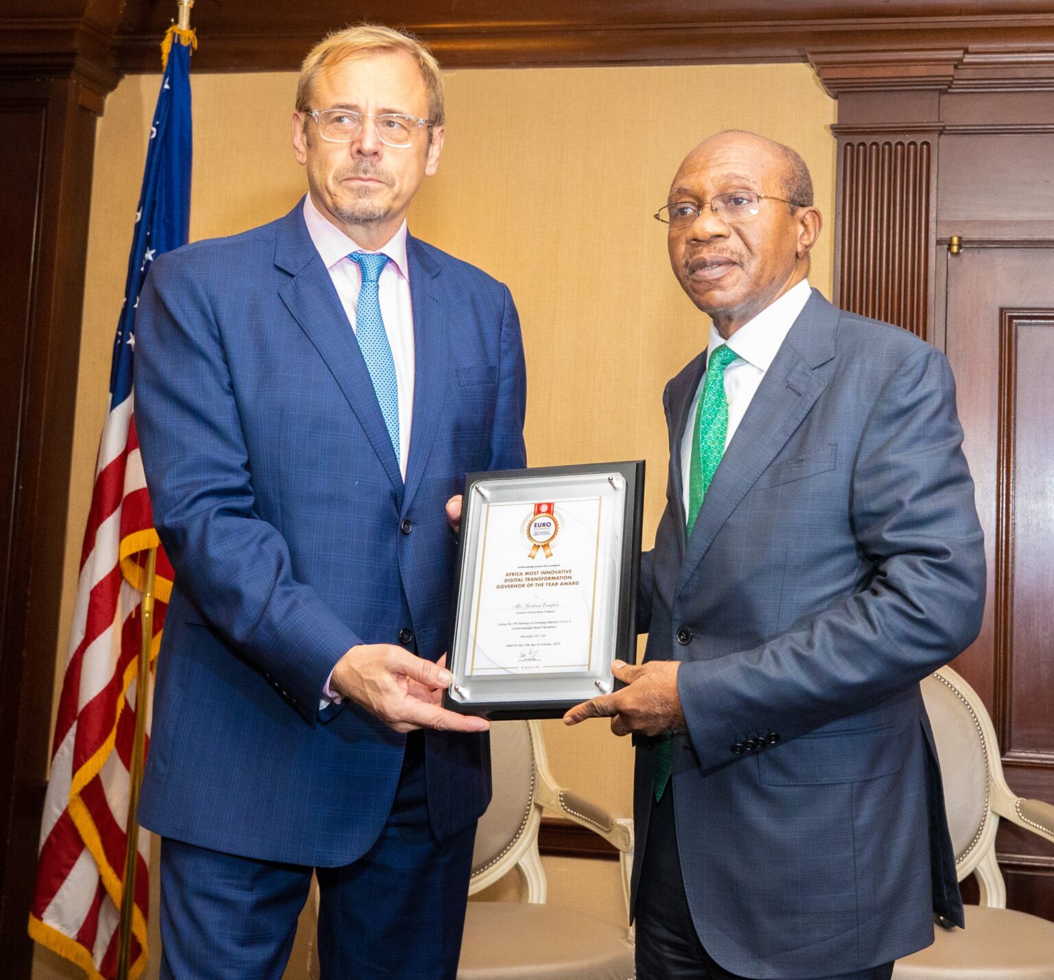 Presenting the award to Mr. Emefiele at a ceremony held at the Willard Intercontinental Hotel, Washington DC, on Thursday, October 13, 2022, on the sidelines of the Annual meetings of the IMF/World Bank Group holding in Washington DC, the Advisor, Euroknowledge, Mr. Andreas Deutschmann, commended the CBN Governor for leading innovation among central banks on the continent.
