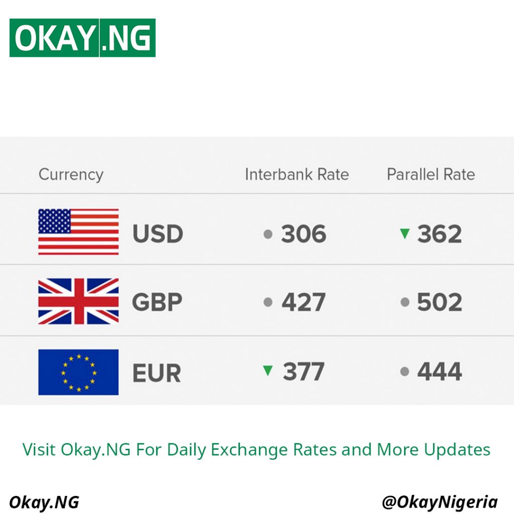 Today’s 19/3/2018) exchange rate of the Nigerian Naira against the Dollar, Pound and Euro.