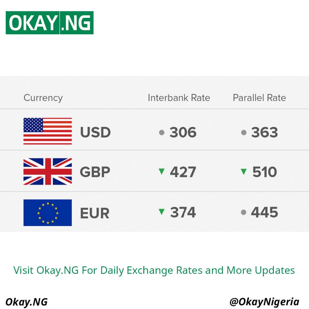 Today’s 25/4/2018) exchange rate of the Nigerian Naira against the Dollar, Pound and Euro.
